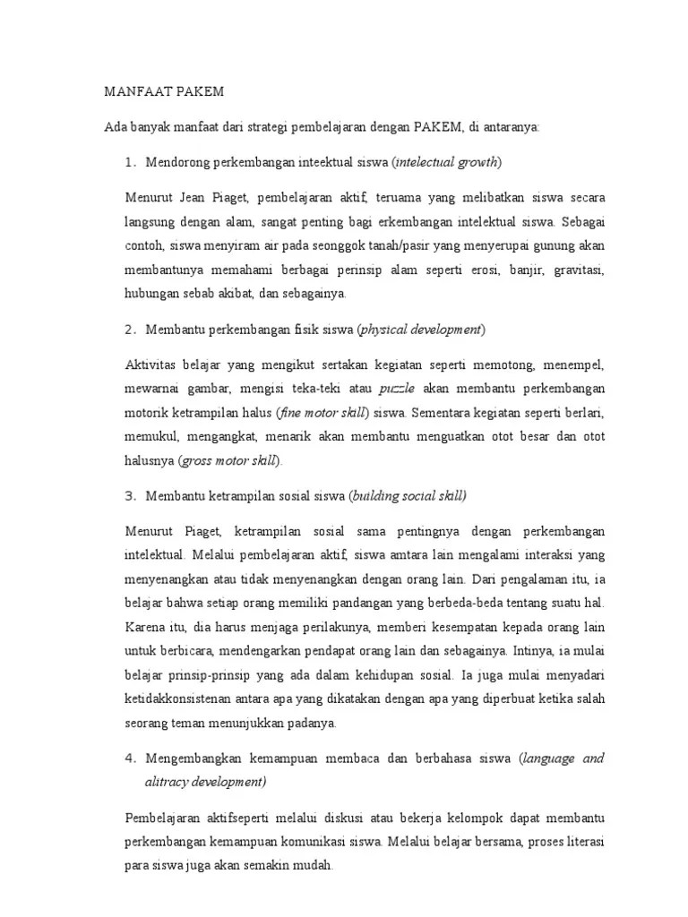 Dari segi guru pakem adalah pembelajaran yang aktif bahwa seorang guru harus memantau kegiatan belajar peserta didik, memberi umpan balik, mengajukan pertanyaan kepada peserta didik. Tetapi, walau file pdf memiliki berbagai keunggulan, nyatanya masih banyak orang yang lebih memilih menggunakan file word. Tidak ada yang dapat mengakses file anda dan privasi terproteksi. Permendiknas, nomor 22 tahun 2006 tentang standar isi. Pakem adalah pembelajaran yang aktif bahwa seorang guru harus memantau kegiatan belajar siswa, memberi umpan balik, mengajukan pertanyaan kepada siswa, memanfaatkan modalitas belajar siswa baik yang visual, auditorial dan kinestetik dalam pembelajaran. Komponen pakem (versi zahra chairani). Pengertian pakem pembelajaran pakem (pembelajaran aktif kreatif efektif dan menyenangkan) berorientasi untuk menggali dan mengembangkan potensi terbesar siswa dengan metodologi pembelajaran yang mengedepankan keatifan anak, mendorong kreatifitas, efektif dalam pencapaian. Atau jatuhkan pdf di sini. Pakem merupakan akronim dari pembelajaran aktif, kreatif, efektif, dan menyenangkan. Secara teoritis hasil penelitian ini diharapkan dapat : Manfaat pakem ada banyak manfaat dari strategi pembelajaran dengan pakem, di antaranya: Manfaat dari penelitian ini antara lain: Bapak tatang, kepala bagian akuntansi rumah sakit panti nugroho pakem yang banyak membantu penulis dalam pengumpulan data.